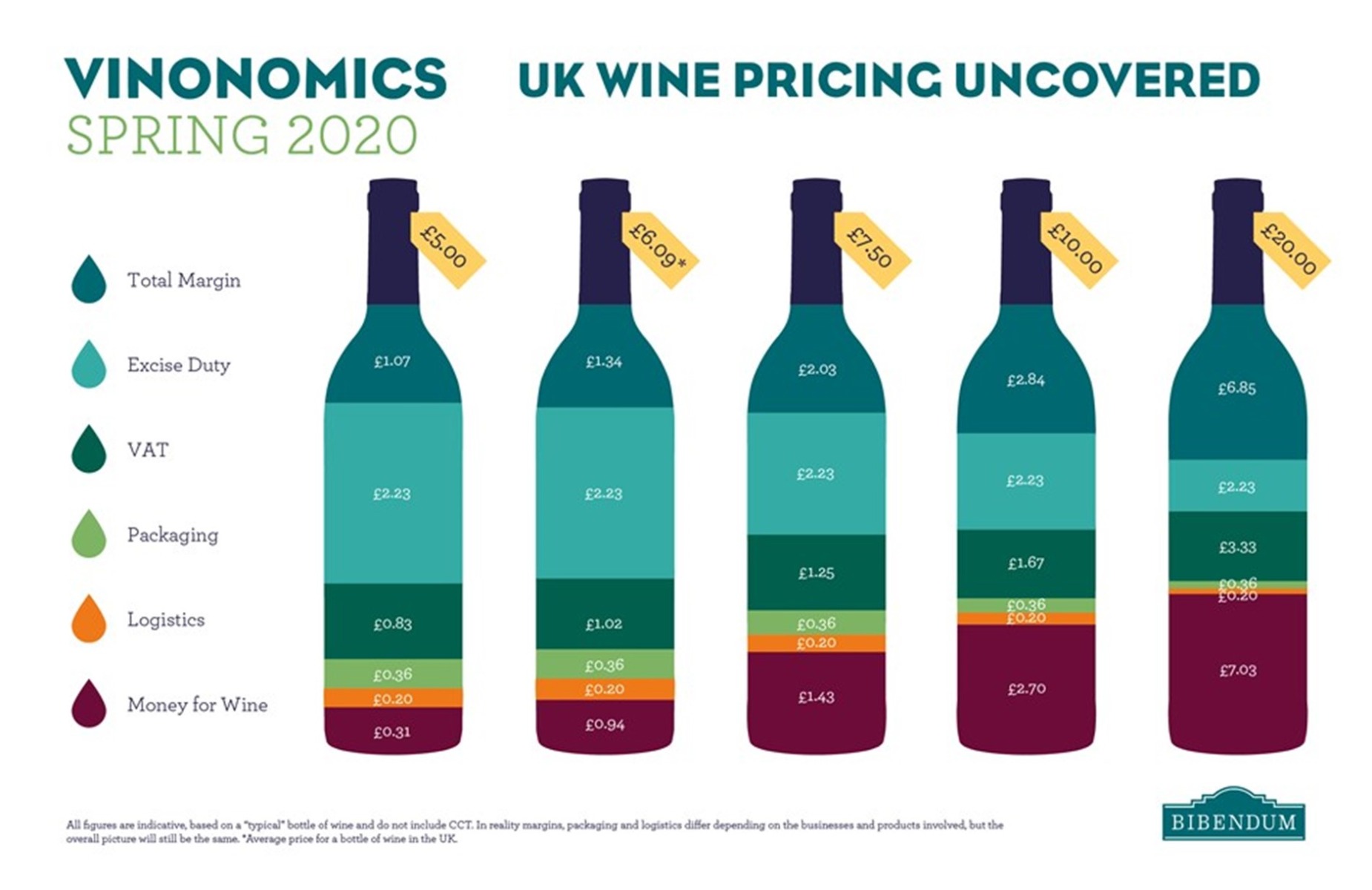 While only 6.2% of the price of a £5 bottle of wine (31p) goes towards the liquid in the bottle, that figure increases to 27% (£2.70)and 35.2% (£7.03) respectively for a £10 and £20 bottle.